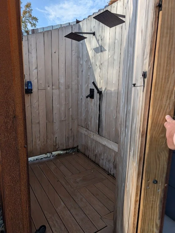 The outdoor shower was a cool project that resulted in a two person outdoor shower with an interior lined in cedar and exterior clad in a very cool corten steel (it protects itself with rust).